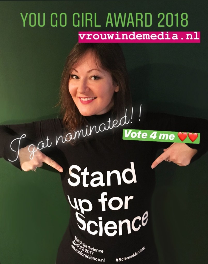 Based on my media performance around the Dutch March For Science, and my chairmanship at the Stand Up For Science movement, I got nominated for this prize by a jury, together with 5 other women out of a large amount of submissions!